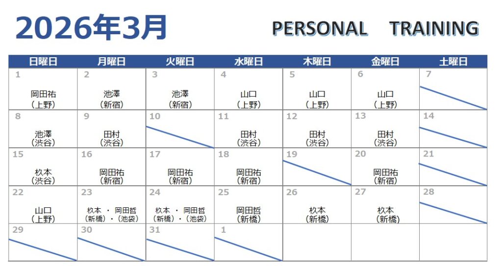 関東パーソナルトレーニング3月スケジュール! お知らせ 2026.02.25 お知らせ 時間会員様価格50分8,000円70分9,900円90分14,000円 平日:11時、13時、15時土曜:13時、15時、17時日曜:10時、12時、14時、16時となっております。 時間内は1対1のマンツーマンなので、短時間で集中してトレーニングを行う事が出来ます。是非この機会にご活用ください! 各トレーナーの枠には限りがございますのでご予約は早めにお願いいたします🙇 ご予約はコチラから